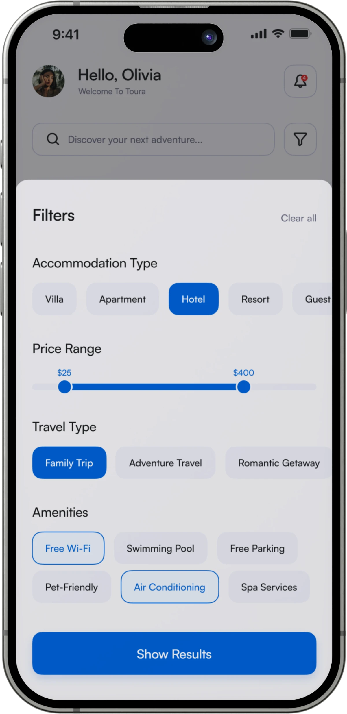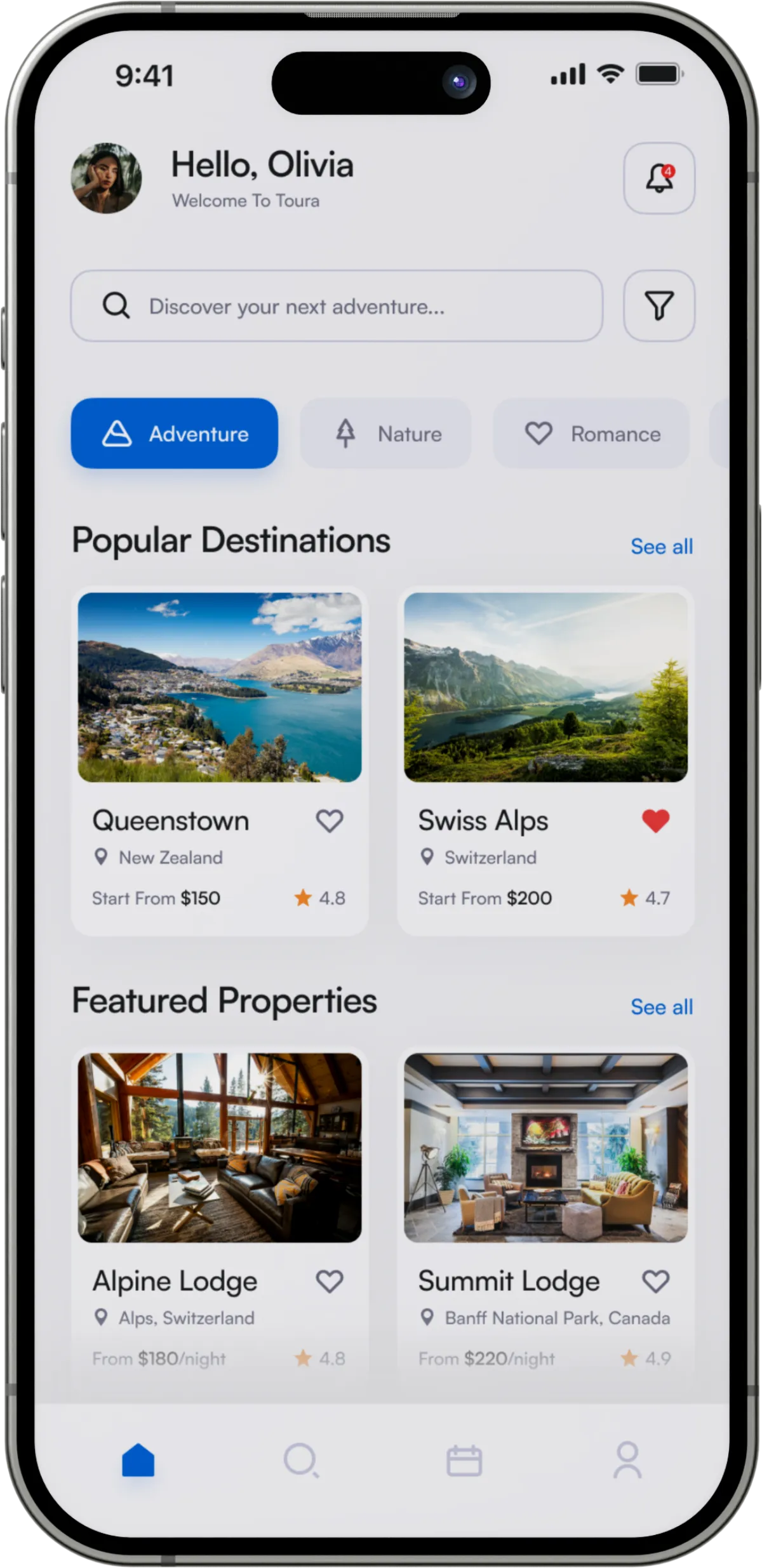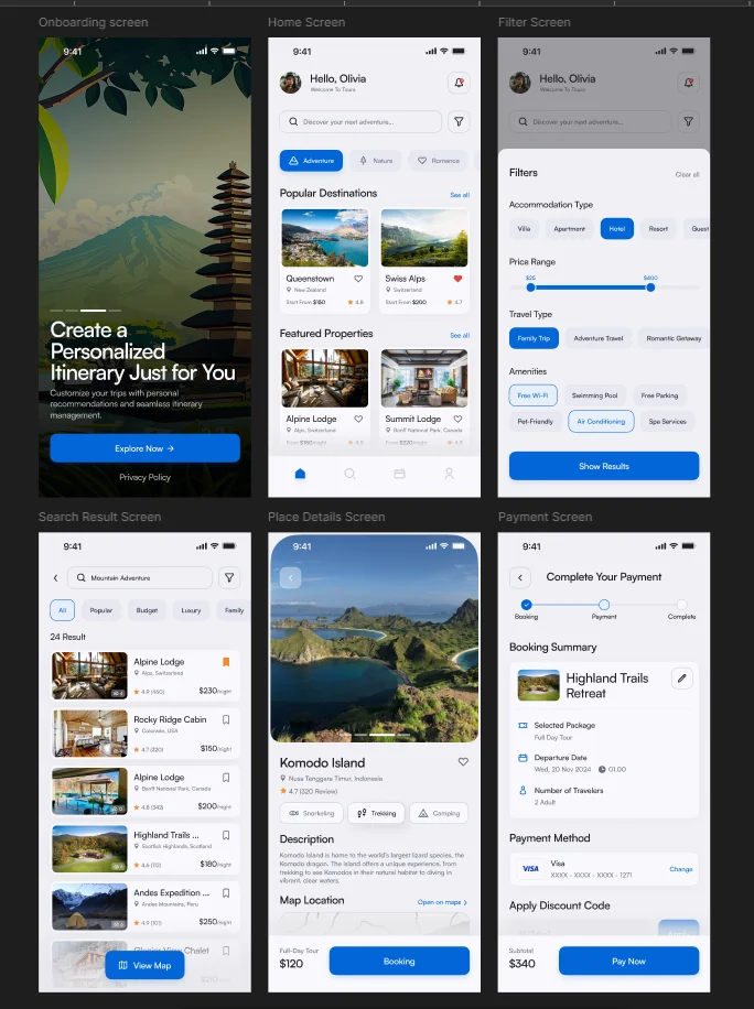 Toura is a travel booking app designed to help users discover and book trips that align with their personal preferences. With an intuitive design and easy navigation, Toura is built to simplify travel planning by offering an array of destination categories, from adventure and relaxation to family-friendly and cultural experiences. Toura addresses the needs of travelers looking for a platform that provides unique destination recommendations, along with quick access to detailed information and booking options.