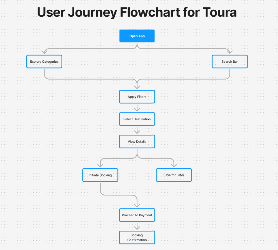 This flowchart illustrates the main journey users take within the Toura app, from opening the app to finalizing a booking. Starting with category exploration or search, users can apply filters to refine their options and select a destination. The journey includes pathways for viewing trip details, saving destinations for future reference, and proceeding with booking and payment. This flow was designed to provide a seamless and intuitive experience, ensuring users can easily navigate through options and make bookings efficiently.